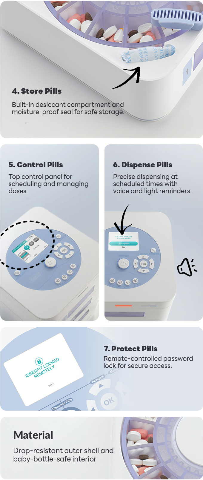 Never miss a dose with multiple reminders—choose from LED light notifications, voice alerts, classic alarms, or melodic tones. Ensure medication safety with built-in desiccant compartments, humidity alerts, and a sealed design to keep pills fresh and uncontaminated.