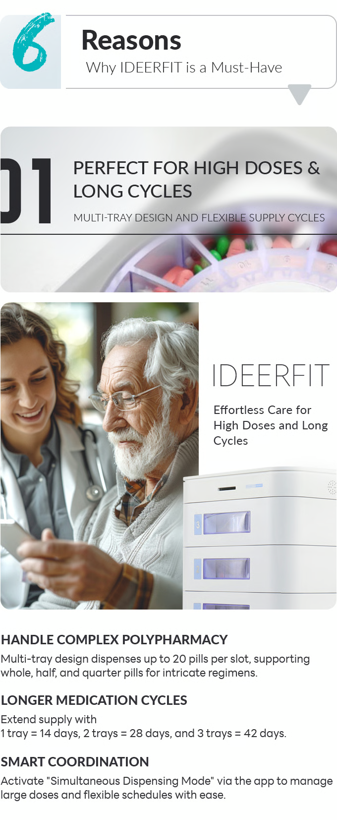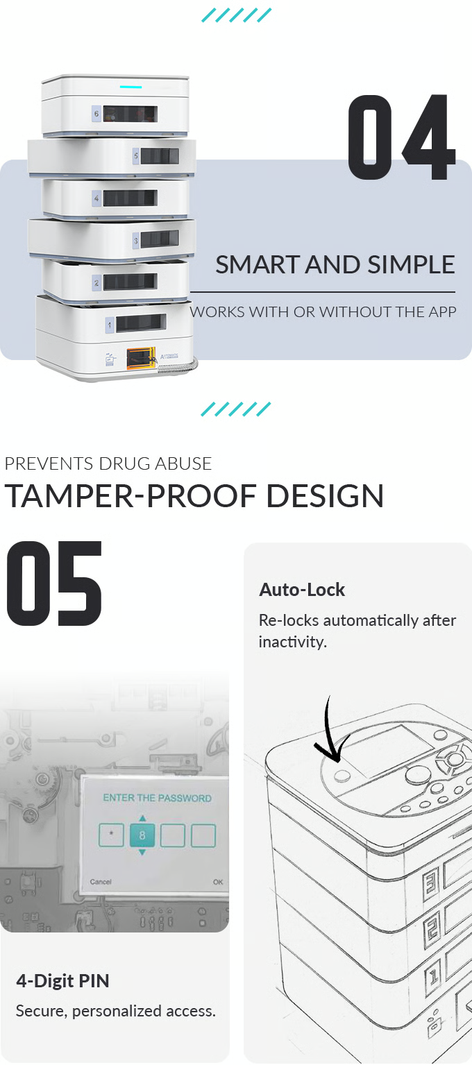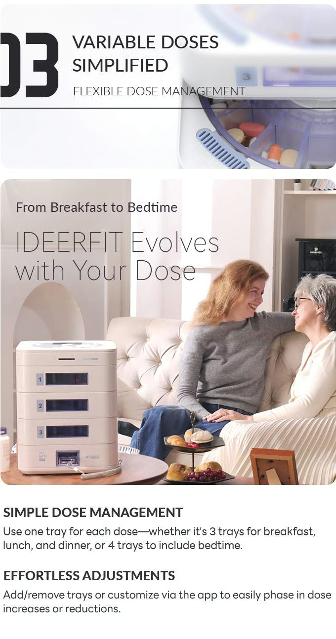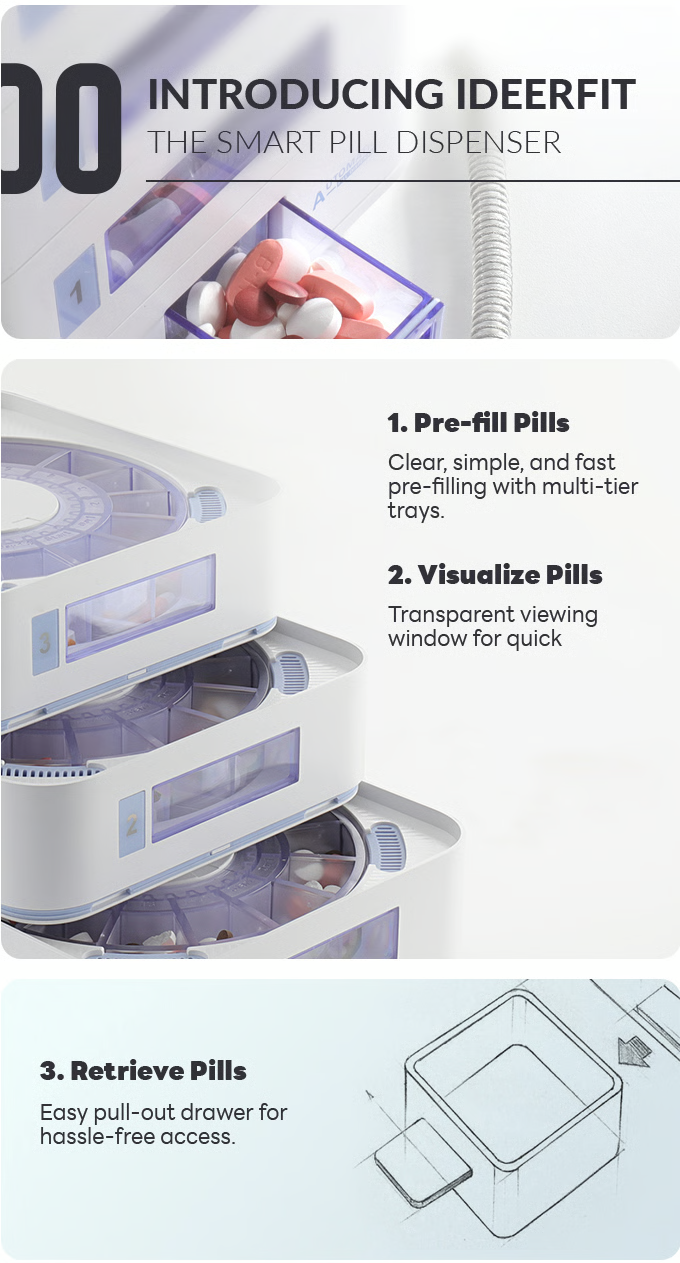ideerfit’s exclusive multi-tray design revolutionizes medication management. With personalized scheduling, precise dose tracking, and built-in storage protection, it ensures safety and convenience for your loved ones. Remote app control and real-time updates bring peace of mind, no matter the distance. Simplify health routines effortlessly.