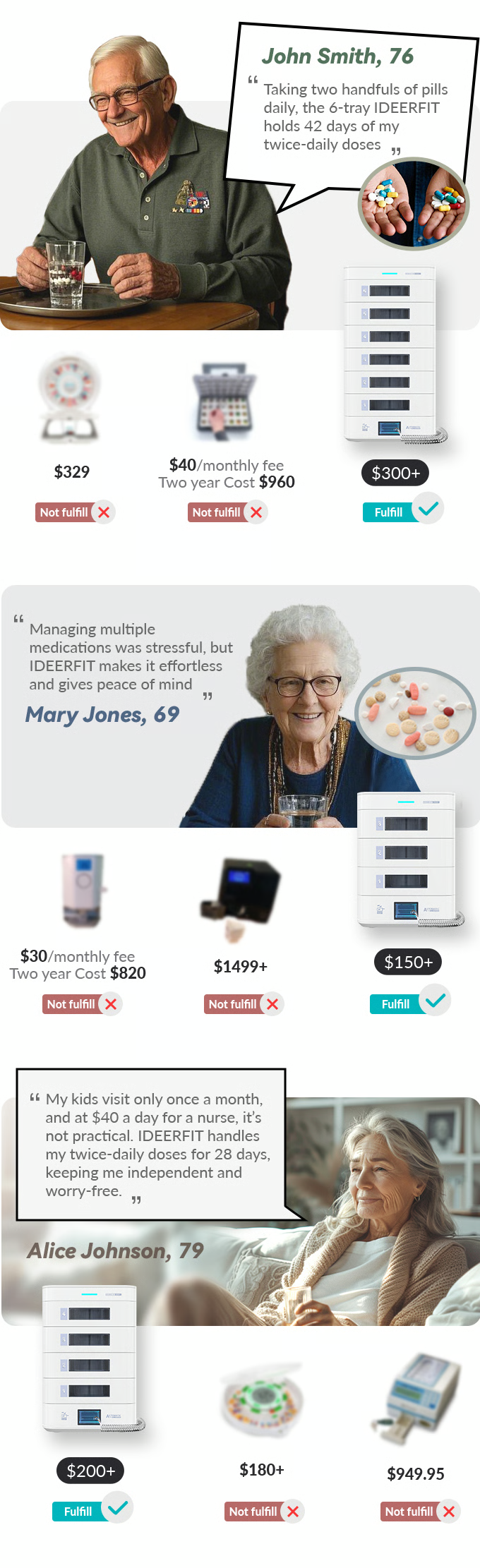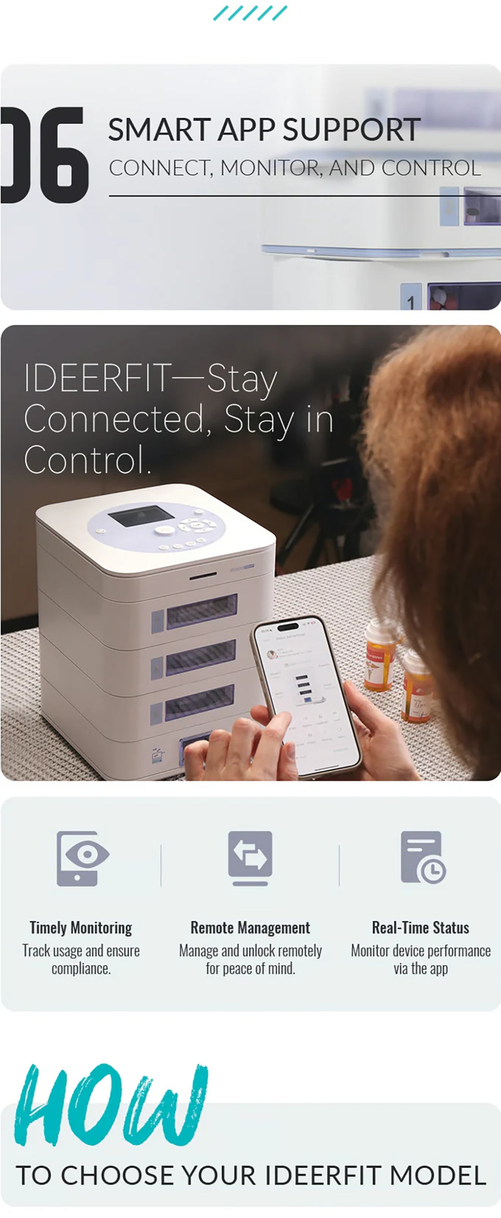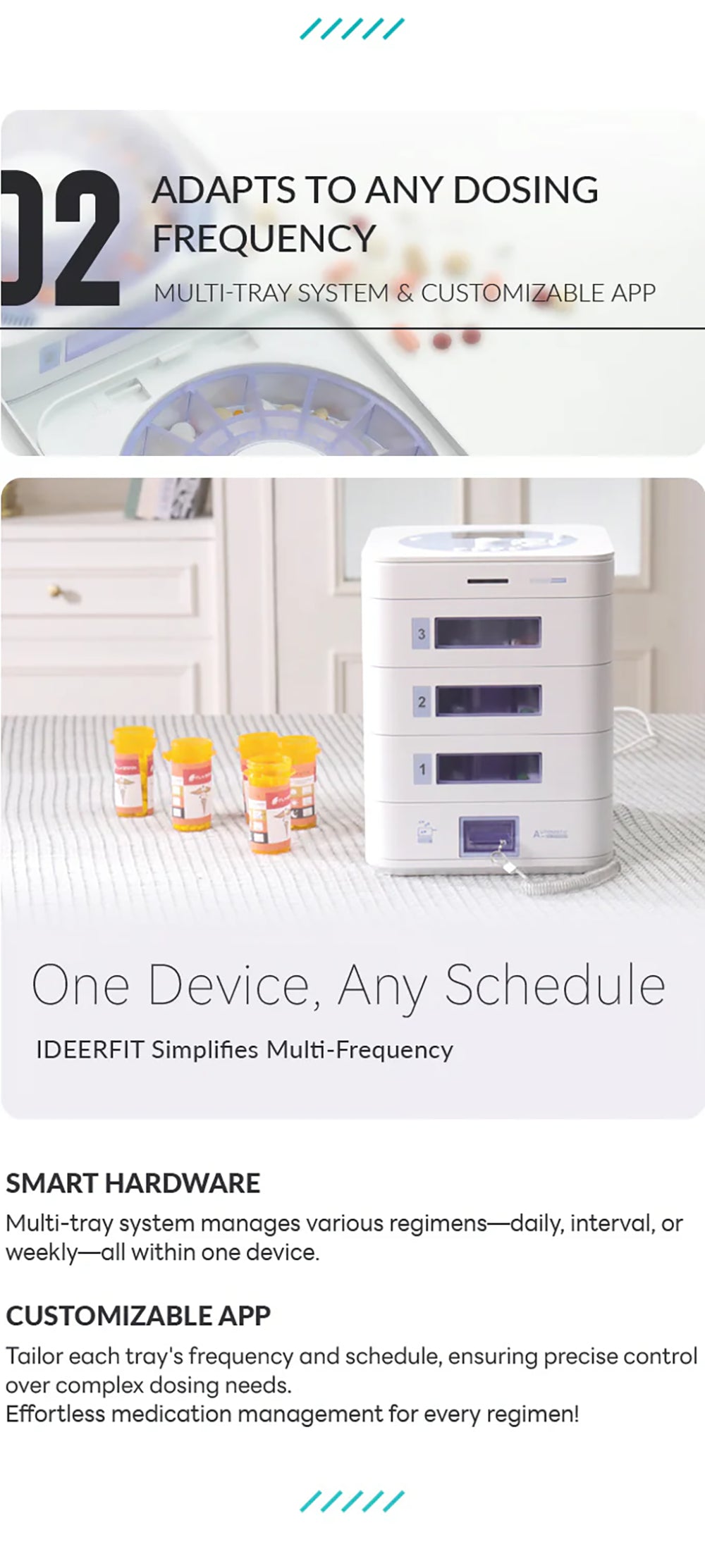 ideerfit’s exclusive multi-tray design revolutionizes medication management. With personalized scheduling, precise dose tracking, and built-in storage protection, it ensures safety and convenience for your loved ones. Remote app control and real-time updates bring peace of mind, no matter the distance. Simplify health routines effortlessly.