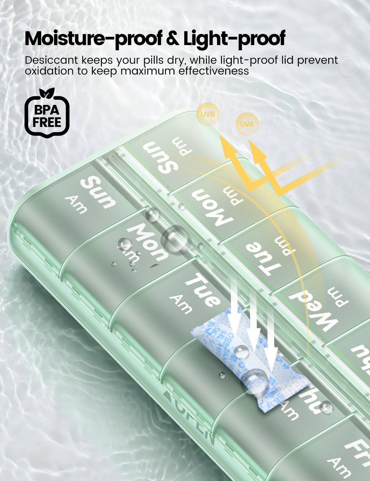 - 【Moisture-Proof & Light Protection】 An independent desiccant compartment and opaque lids keep tablets dry and shielded from light. This moisture-proof pill organizer preserves pill freshness and potency throughout your weekly routine.