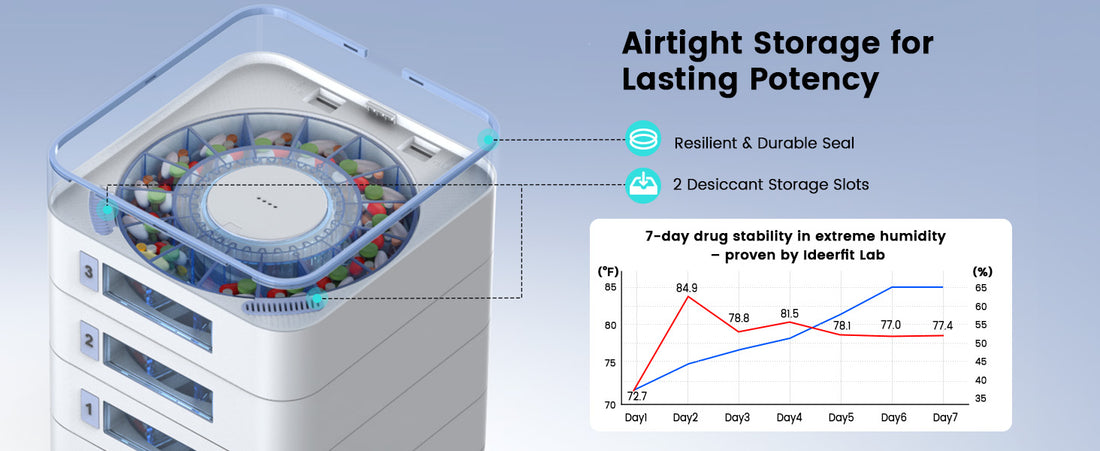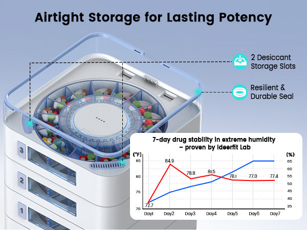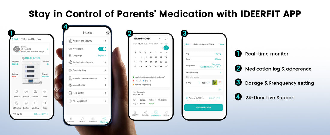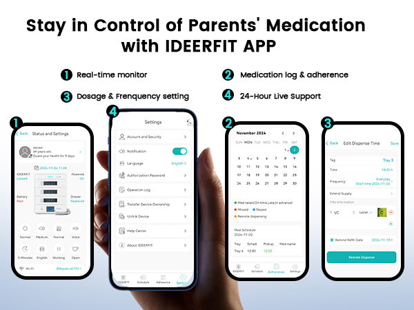 ideerfit’s exclusive multi-tray design revolutionizes medication management. With personalized scheduling, precise dose tracking, and built-in storage protection, it ensures safety and convenience for your loved ones. Remote app control and real-time updates bring peace of mind, no matter the distance. Simplify health routines effortlessly.