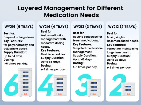 - 3-Tray Design for Flexible Dosing: Each tray has 14 pill slots (1 slot = 1 dose). Each tray represents one time of day—morning, noon, or night. 【Once a day = 42-day supply】 ,【Twice a day = 14-day supply】 ,【Three times a day = 14-day supply】, No manual rotation, No rings, Just fill and go